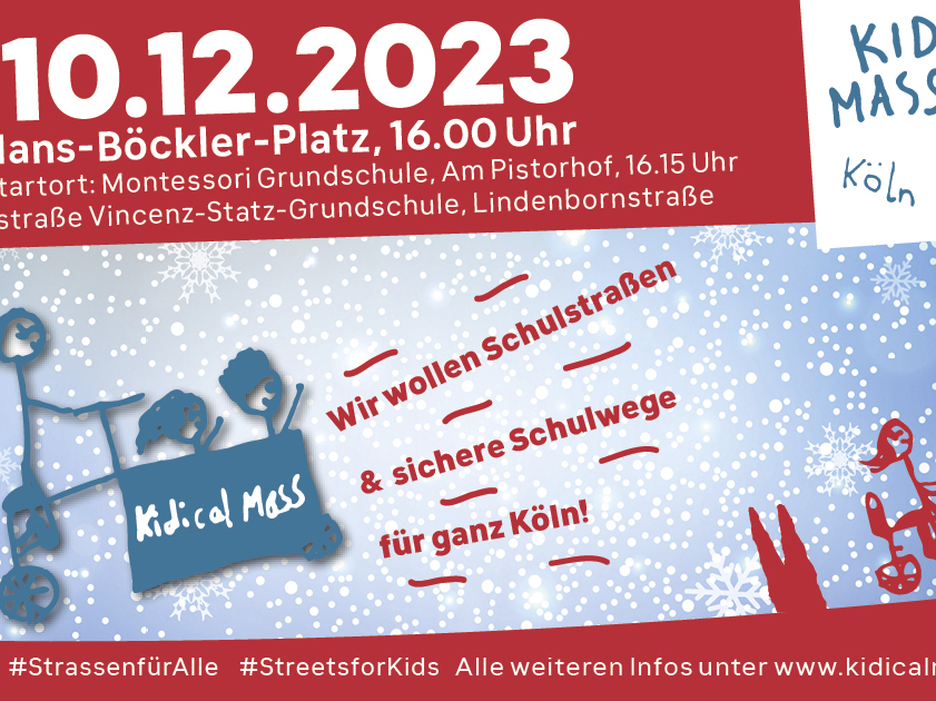 Am Sonntag, 10.12.2023 erstrahlt die Kidical Mass noch einmal im schönsten Lichterglanz. Die letzte Tour des Jahres steht unter dem Motto „Schulstraße und sichere Schulwege für ganz Köln“. Ziel der